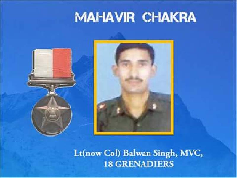 Lieutenant Balwan Singh as a Ghatak Platoon Commander was tasked to assault the 'Tiger Hill Top as part of a multi pronged attack located at16,500 feet which was snowbound and interspersed with crevasses and sheer falls. The officer, set about his task with single-minded determination and led the team for over twelve hours along a very difficult and precarious route and under intense artillery shelling to reach the designated spur. The team used cliff assault to reach the top with stealth and took the enemy by complete surprise. The enemy panicked and in a desperate fire fight attempted to repulse the Ghataks. In the ensuing firefight, Lieutenant Balwan Singh was himself seriously injured. He moved swiftly to encircle the enemy and engaged them in close combat and single handedly killed four enemy soldiers. The daredevil act, inspirational leadership, conspicuous courage and bravery were instrumental in the capture of Tiger Hill. For this courageous act Lt Balwan Singh was awarded Mahavir Chakra.