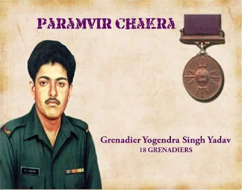3/4 July 1999. Grenadier Yogendra Singh Yadav was part of the leading team of Ghatak Platoon which was tasked to capture Tiger Hill. The approach to the top was steep, snow bound and rocky. Unmindful of the risk involved, he volunteered to fix the rope for his team to facilitate the climb to the Top of Tiger Hill. On seeing the climb of the team, the enemy opened intense automatic grenade, rocket and artillery fire killing the commander and two of his colleagues and the assault of the platoon was stalled. Grenadier Yadav crawled up to the enemy position to silence it and in the process sustained multiple injuries. Unmindful of his injuries he continued lobbing grenades and kept firing from his weapon which resulted in killing four enemy soldier and silenced the automatic fire. Inspired by his gallant act, the platoon charged on to the other positions and ultimately captured Tiger Hill Top. Grenadier Yogendra Singh Yadav displayed the most conspicuous courage, indomitable gallantry, grit and determination under extreme adverse circumstances and was awarded Param Vir Chakra.